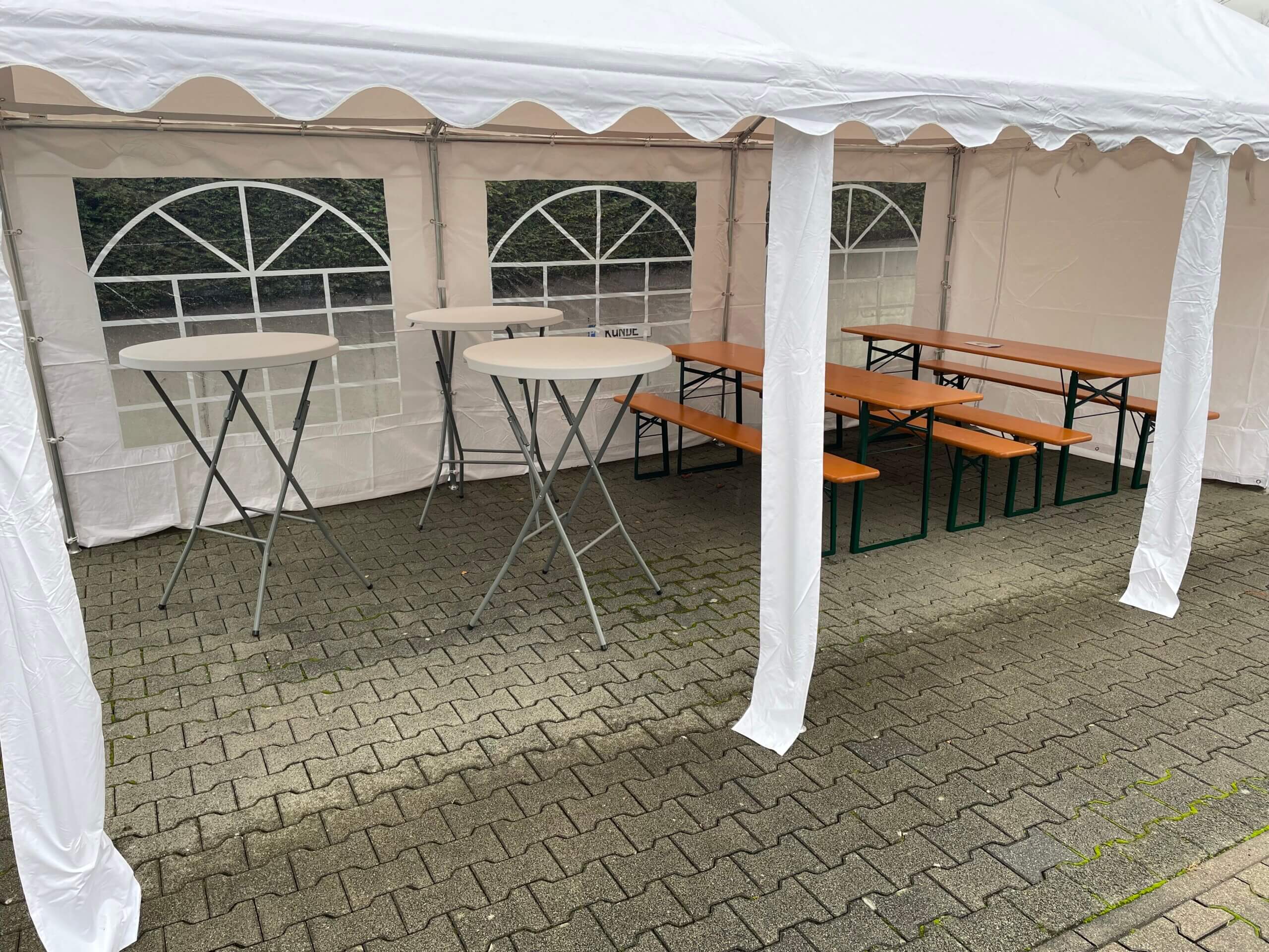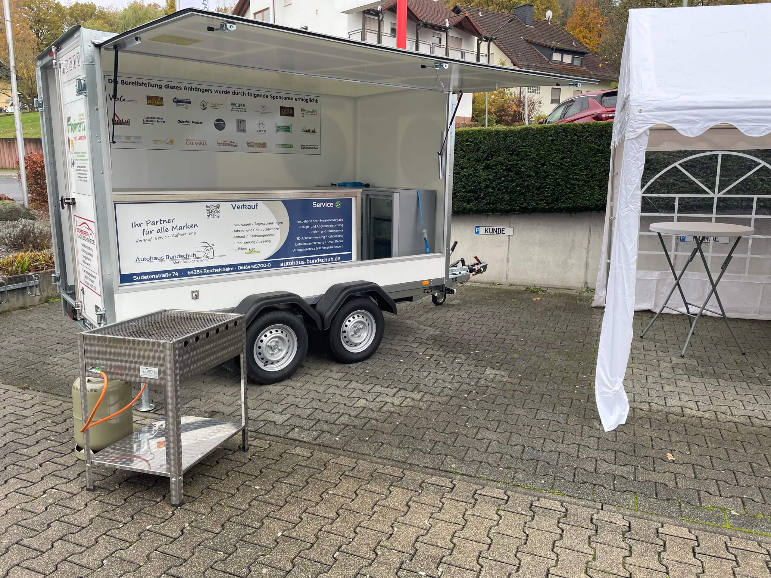 Ausstattung: Brenderup-Anhänger mit Verkaufsklappe, Maße: 3,1 m (L) x 1,6 m (B) x 2 m (H), inkl. Festzelt (3 x 6 m), 4 Festzeltgarnituren, 6 Stehtische, Theken-Kühlschrank (330 l), Ausgabetheke, 3-flammiger Gastro-Grill